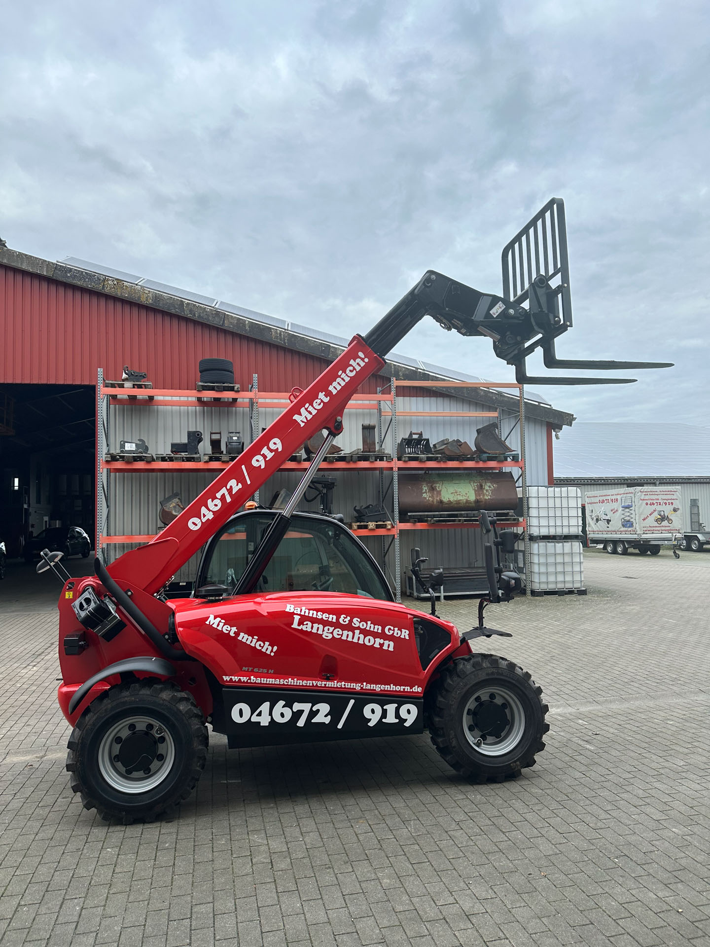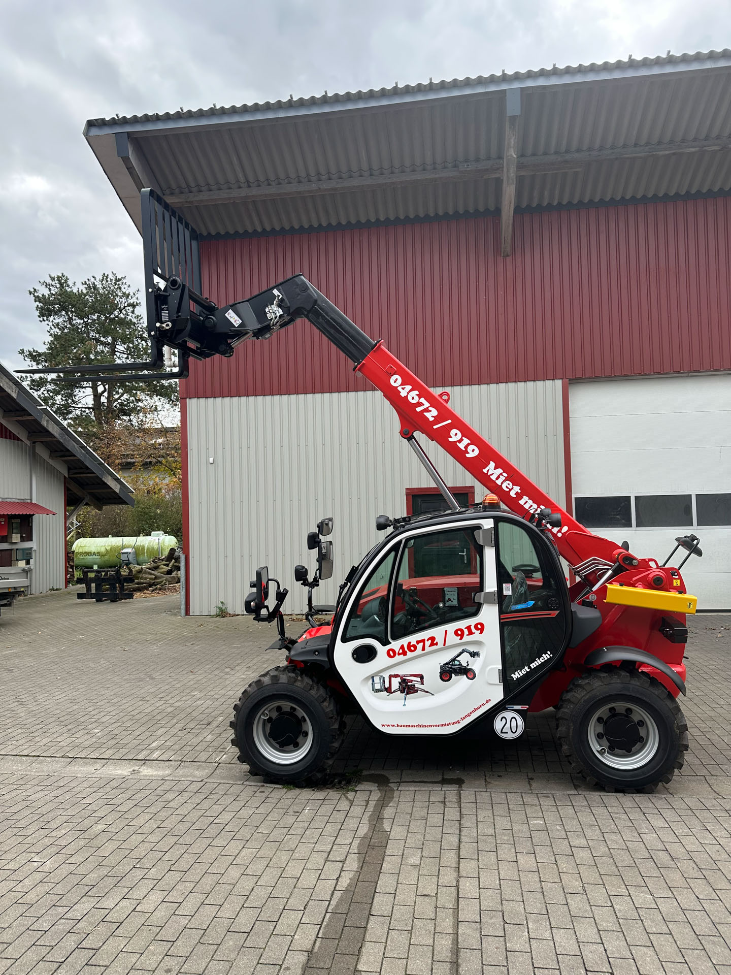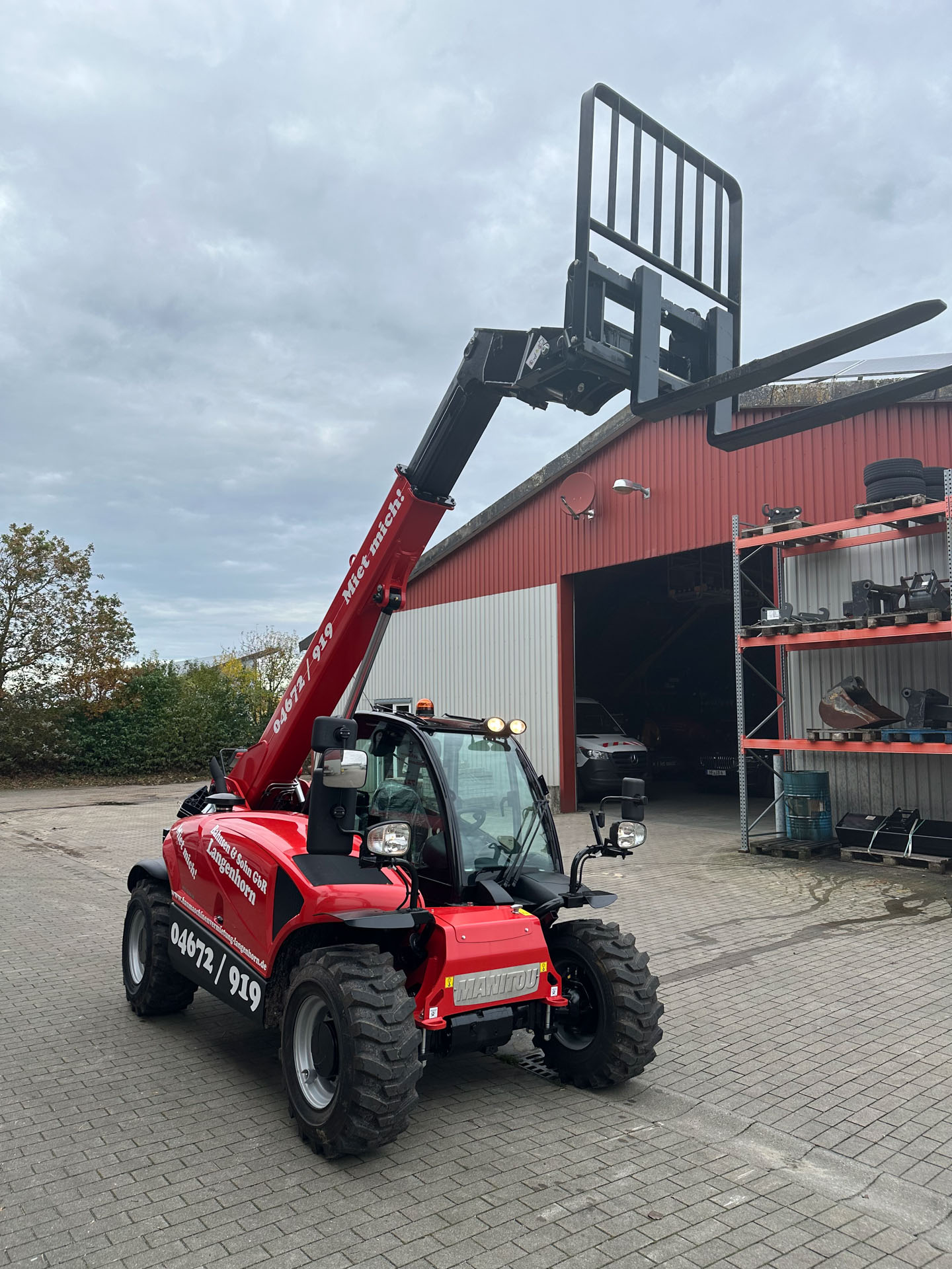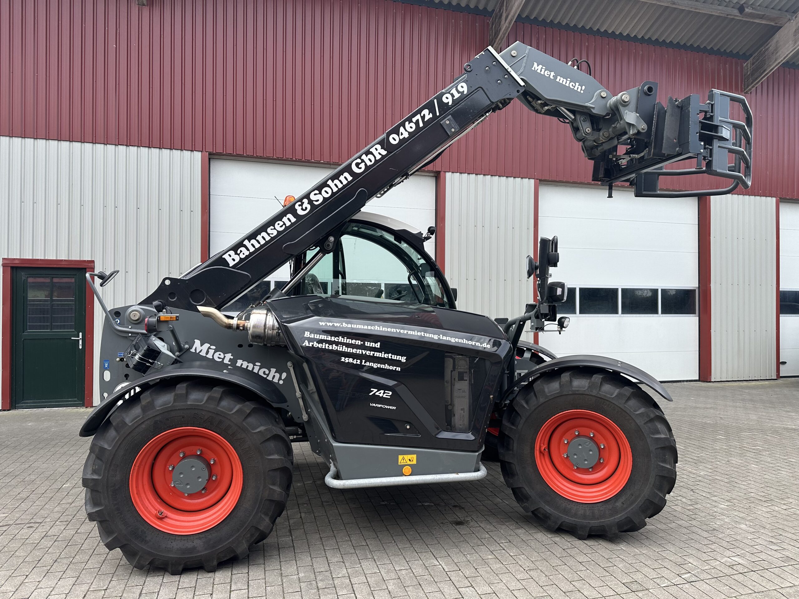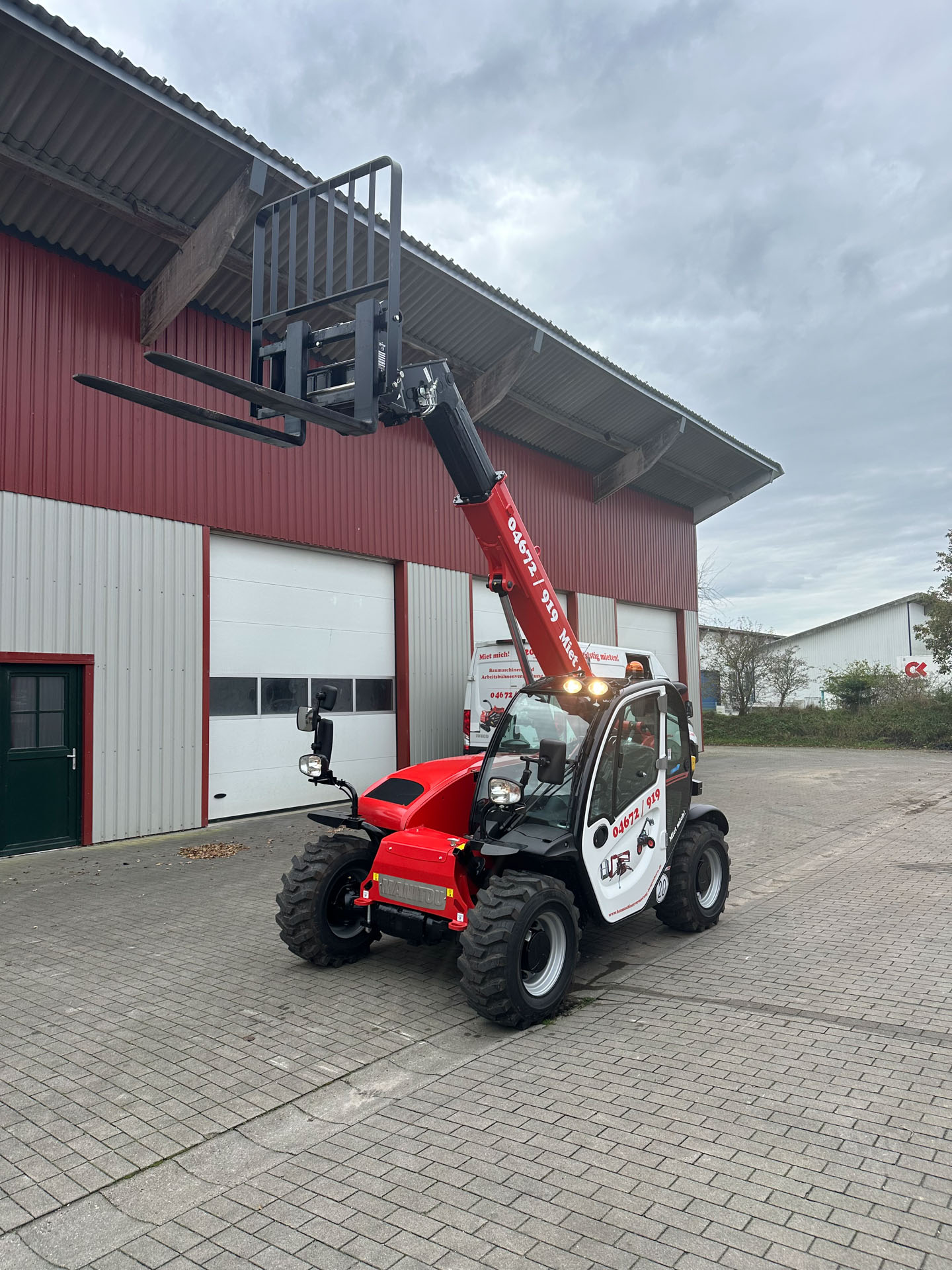 Mit einer Schaufel oder Kornschaufel und Palettengabel können unsere Teleskoplader Lasten bis zu 4t heben. Eine Mastverlängerung und ein Lasthaken stehen dem Teleskoplader auch zur Verfügung.